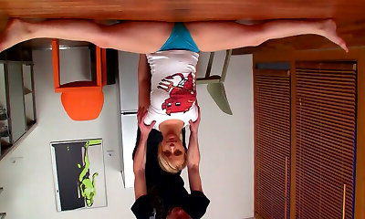 Ardent pliable blond head gal opens up legs and gets twat licked in the kitchen