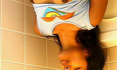 Slender milky brunette teenie with skinny as filmed from above in the toilet