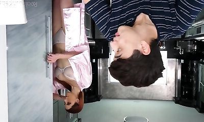 Risky jerk off while watching big rump hijab stepmother in the kitchen.