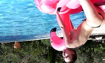 Attractive honey Milla has great fun on the inflatable pink flamingo in the pool