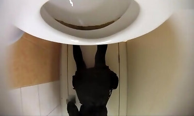 Slender milky brunette teenie with skinny as filmed from above in the toilet