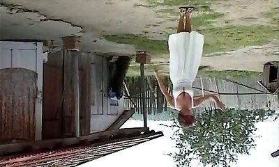 Appetizing and sexy German village girl stretches her legs on the hood of the car